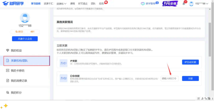 2.点击左侧“ 关联机构/团队 ” ,选择口令关联 ,输入6位口令(2ZZLDZ),点击“ 关联 ”(请勿使用IP 绑定)。
